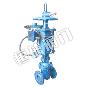氣動帶手動閘閥是具有氣動執(zhí)行機(jī)構(gòu)(雙層氣缸,并帶有緩沖機(jī)構(gòu))和手動及其保護(hù)機(jī)構(gòu)(手動和可自鎖的氣動-手動轉(zhuǎn)換裝置)的低支架明桿閘閥。該閥門由于采用雙層氣缸結(jié)構(gòu),其與單氣缸式氣動閘閥相比,提升力增大了一